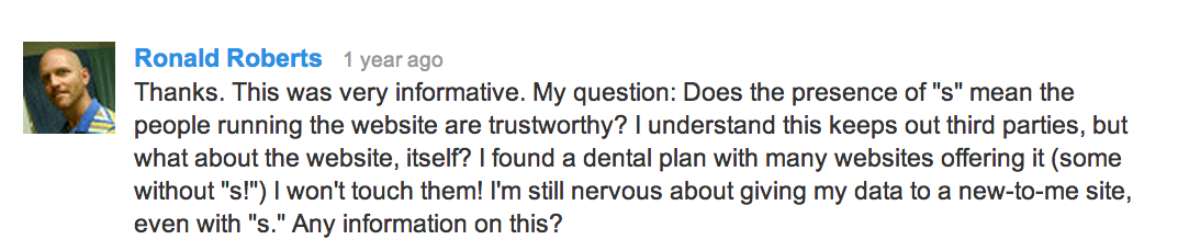 Hey guys. I was looking through our YouTube channel and noticed that we had a question from YouTube user Ronald Roberts. So this is a video response for you, Ronald. Here's Ronald's question. Does the presence of 's' mean the people running the website are trustworthy? I understand this keeps out third parties, but what about the website itself? I found a dental plan with many websites offering it. Some without 's'. I won't touch them. I'm still nervous about giving my data to a new-to-me site, even with 's'. Any information on this? Ronald that's a wonderful question and one I'm happy to answer. One that does get a little bit confusing so I'm gonna try to break down to simply as possible. So what you need to be worried about is web sites that you're going to and you're inputting sensitive information. Your information. If you're putting it in forms, so let's say a common might be your first name, your last name, social security number, any diagnosis information about yourself really anything you would deem sensitive, you wouldn't want to put that on a web page that didn't say HTTPS. If it says HTTP, when you click Submit on that webpage, what you're doing is you're sending that data in clear text. But if you're just browsing the web, reading information-only text on sites, or your favorite blog or website you enjoy you're okay to be on a site that's just HTTP. Some of the things you can do, you can ask if you're giving sensitive data, especially card information, you can ask to see their PCI compliance certificate. That will show that they have done everything they can to maintain the proper standards for their website. Another good point to make is that HTTPS is specific to the page you're on. Meaning that is really not universal for an entire website. That doesn't mean that the entire website isn't secured with HTTPS, but it also doesn't mean that it is. So anytime you're on a web form our web page that is asking you for sensitive data it is absolutely mission-critical that you make sure that site has HTTPS. If it doesn't, I would advise you not to put your sensitive data there. Well Ronald, we hope this was responsive and helpful. And as we always say, if you have any more questions, please ask. See ya next time. HTTPS is specific to the page you’re on. It’s not universal to a website. So it doesn’t really matter if the homepage of your favorite sweater website says HTTPS if their payment page doesn’t. When HTTPS fails HTTPS isn’t entirely 100% foolproof, as the Heartbleed vulnerability proved in April 2014. The Heartbleed vulnerability wasn’t necessarily a weakness in SSL, it was a weakness in the software library that provides cryptographic services (like SSL) to applications. Still, it is estimated that half a million secure web servers were affected. Luckily, most websites have since corrected that bug.